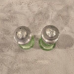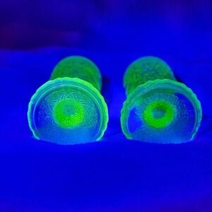 Keywords: uranium glass, salt and pepper shakers, vintage, retro, glowing glass, pedestal, footed, kitchen decor, collectible, etched glass, floral design, green glass, antique, tableware