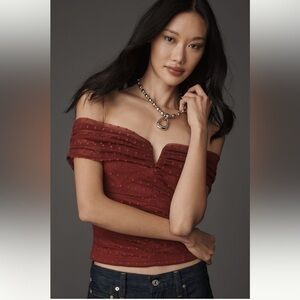 Romantic and flirty Anthropologie Dolan Left Coast mesh off-the-shoulder top in a rich burgundy hue. Brand new with tags, originally $78. Features a delicate polka dot mesh overlay, subtle ruching for a flattering fit, mini V-neckline, and off-the-shoulder sleeves. Lightweight and easy to dress up or down—perfect for winter-to-spring styling, date nights, brunch, or Valentine’s Day looks. Size XL runs small could fit a large 100% polyester. Pullover style.