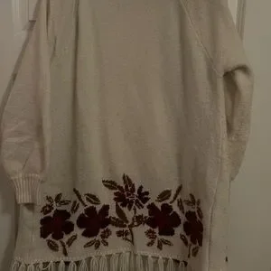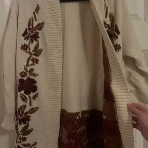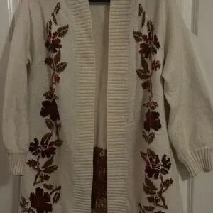 Elegant cream cardigan with floral designs. Perfect for layering and adding style. Some wear to it