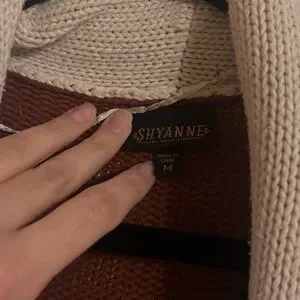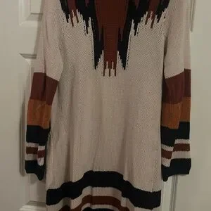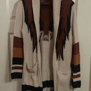 Cozy open front cardigan with striking patterns. Features cream, brown, and black tones. Perfect for layering.