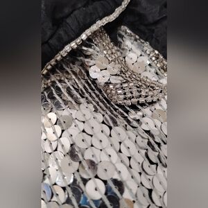 The diagonal silver fire fringe hem makes this piece a knockout.