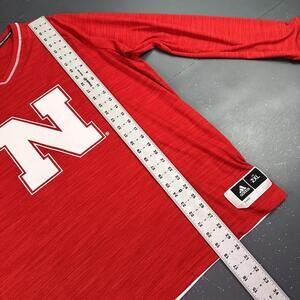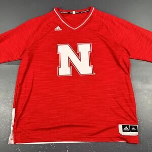 Adidas Nebraska Huskers basketball warm-up shirt in size 2XL. This performance shirt features a bold red color with white accents, including a large 'N' logo on the front and 'NEBRASKA' text on the back hem. Made from 100% polyester, it offers a lightweight and breathable fit ideal for athletic activities or casual wear. The shirt is in good condition, it does have a few white specs on back of shirt.