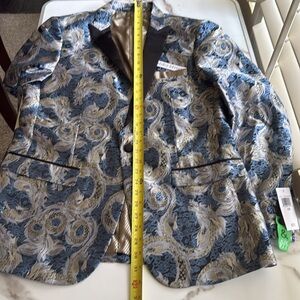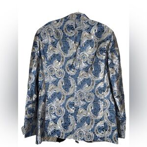 A metallic dragon paisley print accents this jacket for eye-catching appeal at your formal events. Notched colar, two front decorative pockets, one button closure. Four satin buttons on each sleeve, Inside- lined, one button pocket closure, three slip pockets. NWT