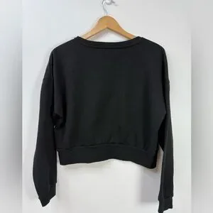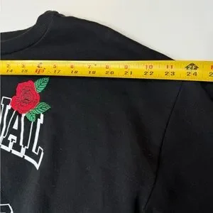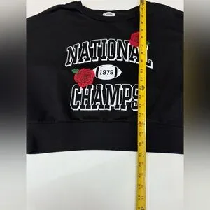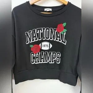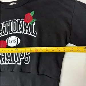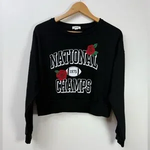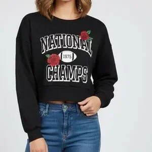 Cropped black sweatshirt with bold 'National Champs' print. Features red rose accents. Ideal for casual outings.