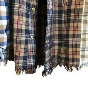 Upcycled oversized mixed print button-down shirt, size M-L, brown and navy plaids in medium weight woven cotton with fringy hem. This hipster style reworked spliced patchwork shirt (not flannel) in autumn colors would make a nice unique and quirky addition to your wardrobe this fall and winter!