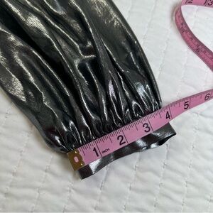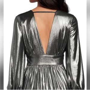 Stunning metallic gown with long sleeves. Features a deep V-neckline and elegant slit. Perfect for evening events. Zella Metallic Lame Plunging V-Back Front Slit Long Sleeves Gown Maxi Metallic Dress