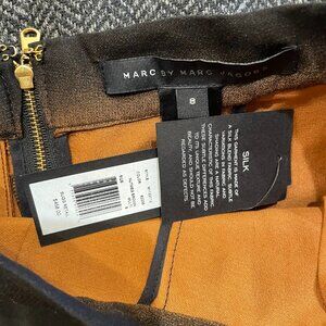 Marc by Marc Jacobs below-knee skirt featuring a high rise with fixed waistband, back exposed zipper closure, box pleats, an unlined interior, and a soft cotton/silk blend fabric in an edgy fall print in black and cognac brown.