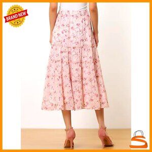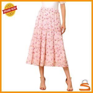 Chiffon A-Line Midi Skirt Floral Print Ruffle Tiered Loose Fit Elastic Waist
