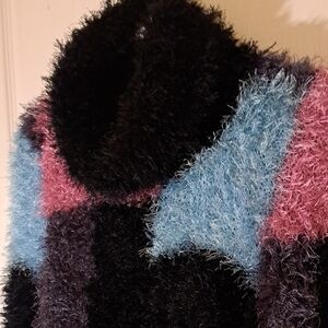 Bring back the bold Y2K vibes with this fuzzy colorblock turtleneck sweater! Featuring a playful mix of pink, teal, and black tones, this piece is all about texture and attitude. Perfect for making a statement in your retro-inspired fits or adding a pop of fun to your winter wardrobe.
