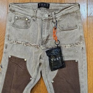 Brand new with tags THRT DENIM WAGONEER C22 Jeans in Khaki Brown, size 30. Premium multi‑tone patchwork construction with utility paneling, raw hems, and the signature detachable THRT pouch with orange chain. This is a limited‑run model retailing for $130, rarely found in the resale market.