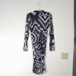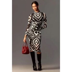 "Embrace the allure of the Pineapple Ikat Black Tulle Midi Dress with its enchanting high neckline and gracefully tailored silhouette. This chic piece showcases a mesmerizing Ikat-inspired pattern in contrasting shades, overlaid with delicate black tulle for a touch of mystique. The sheer long sleeves and hem add a playful transparency, inviting you to twirl into any occasion with confidence and unique style.93% polyester, 7$ elastane stretch mesh tulle fabric in Black Ikat print"