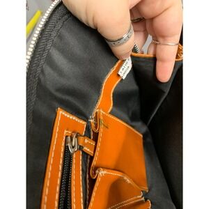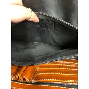 This Latico leather handbag is a stylish and functional accessory perfect for everyday use. The rich orange color adds a pop of brightness to any outfit, while the durable leather construction ensures longevity. The bag features a spacious interior with multiple compartments for organization, making it ideal for work or casual outings. The exterior shows some signs of wear, including scratches and marks, which add character to the bag. See measurements in photos. Measurements (approximate): Width: 15 Height: 11 Depth: 3