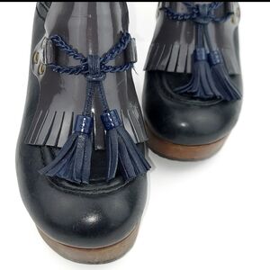 Smooth black leather with dark gray patent leather kiltie, navy blue chain and branded tassel details