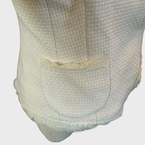 Chic cream blazer with textured fabric. Features subtle frayed edges and front pockets. Ideal for versatile styling.