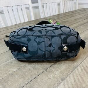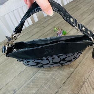 This handbag is a Coach Zoe hobo shoulder bag featuring the brand's signature "C" monogram pattern in black and gray canvas with black leather trim and silver-tone hardware. This specific style, often released in the early 2000s (Y2K era), typically includes a top zipper closure, an adjustable leather strap, and internal pockets.