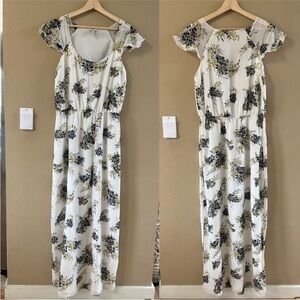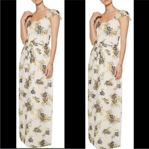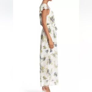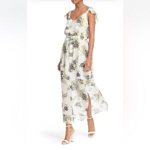 This stunning maxi dress by Joie is perfect for wedding guests and resort wear, featuring a scoop neckline and flutter sleeves. The white and blue color scheme is enhanced by a stylish side slit, adding elegance and movement. Its lightweight fabric ensures comfort and grace for any sunny occasion.