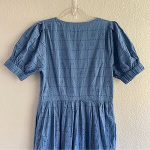 Chic blue eyelet midi dress by Madewell. Features short sleeves and button details. Perfect for casual outings. Not worn by me, just tried on. Still new with tags. Bought for family pictures on the beach. Would have been perfect, but slightly too big.