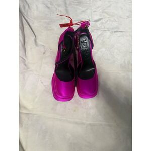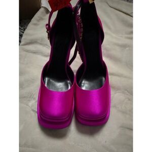 Stunning Versace platform heels in vibrant fuchsia satin with the signature Medusa detail. Purchased at a Versace sample sale and never worn — the original red sample-sale security tag is still attached. Satin is flawless and soles show zero wear. Perfect statement heels for events, photoshoots, nights out, or collectors seeking bold designer pieces.