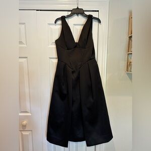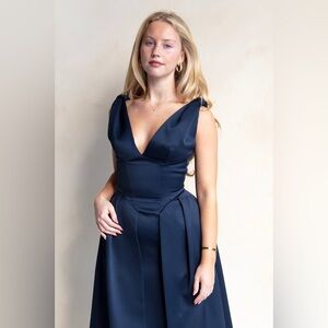 The 'Paloma' Black Satin Dress by House of CB is your ticket to black-tie glamour. Featuring a sultry plunging V-neckline and elegant twisted shoulder straps, this dress elongates the silhouette for a refined look. The satin bodice flows into a flattering V-shape, enhancing the waistline with an illusionary effect, while the midi-length skirt, lined with soft tulle, adds a touch of romance.The overskirt adds elegant drama. With a convenient back zip and options for Regular and Bigger Cup fits, 'Paloma' is ideal for black-tie events, evening weddings, gala receptions, or a night at the opera.