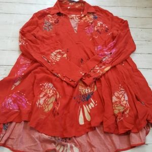 Free People Field Of Butterflies Women's Coral Long Sleeve Boho hi-low mini dress or Tunic Top Size S