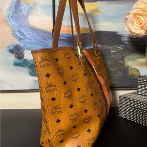 Elegant MCM tote with cognac leather and black logo pattern. Spacious interior.