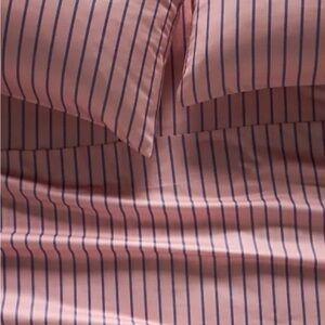 Elegant pink sateen shiny sheets with blue stripes. Soft and stylish. Perfect for any bedroom. Opened and washed once but doesn’t go with the room decor. Twin size, comes with sheet, fitted sheet, and 1 pillow case.