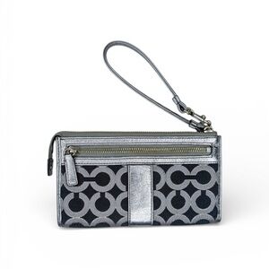 Coach Julia Op Art Signature Lurex large zip top wallet/wristlet. Interior has 6 card slots and 3 large currency slots, and exterior zip pocket.