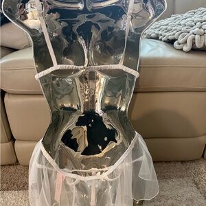Chic white lace chemise with floral details. Features a stylish cut-out design. Ideal for intimate occasions.