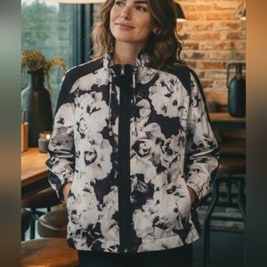 Zenergy Chico's - Black & White Floral Zipper Up Windbreaker, Long Sleeve,...