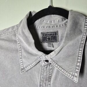 The product is a men's Converse button-down shirt in chambrey gray with a size 2XL. It features a button-up style, long sleeves, and a classic button-down collar. The shirt is designed with a star theme, making it a stylish and casual option for everyday wear.