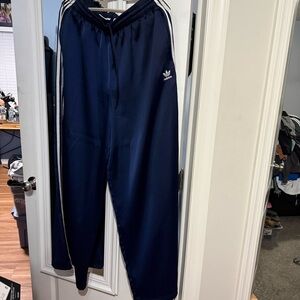 Comfortable dark blue track pants with signature white stripes. Ideal for everyday wear.
