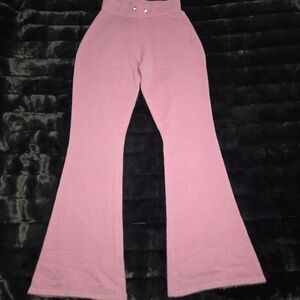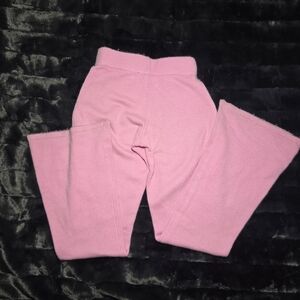 These pre-owned Frankies Bikinis women's boot-cut flare pants are size S and made from 100% cashmere in a vibrant pink hue. The pants feature a high-waisted design with a ribbed knit texture and a subtle flare from the knee down. The waist measures approximately 12 inches across when laid flat, and the inseam is about 32 inches. The pants appear to be in good condition with no significant visible imperfections. #p