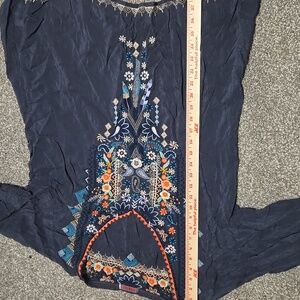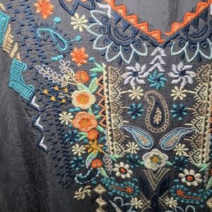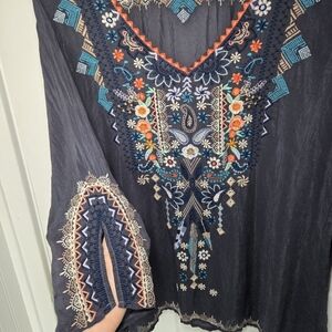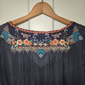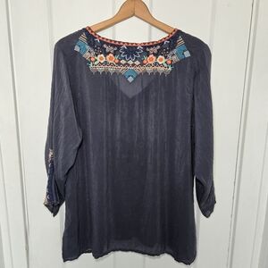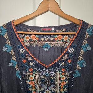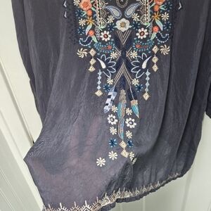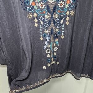 Johnny Was Grey Embroidered Tunic Blouse Sheer Gypsy Bohemian Hippie Size L