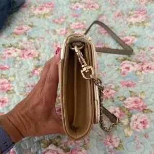 Elegant classic tan cream crossbody bag with gold accents. Features a stylish chain strap.