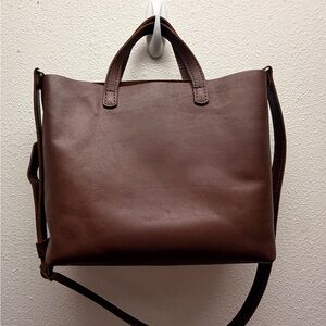 Sophisticated brown leather tote. Ideal for daily use. Features sturdy handles and a spacious pocket.