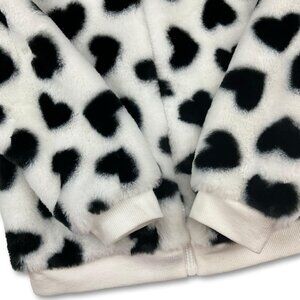 White with black hearts, super soft, full zip, ribbed cuffs/hem, lined interior.