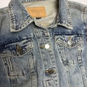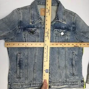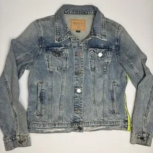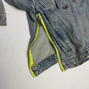 Blank NYC Distressed Denim Jacket Neon Yellow Accent Side Zippers Size Small EUC