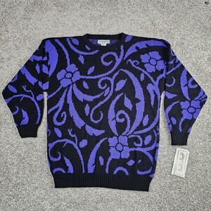 Vtg Jonathan Cass Sweater Womens Small Black Purple Floral Abstract Knit 80s