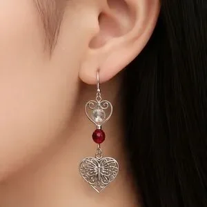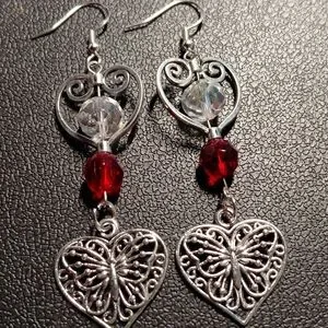 These elegant earrings feature a beautiful silver heart and butterfly design with a striking red accent. Perfect for adding a touch of sophistication to any outfit.