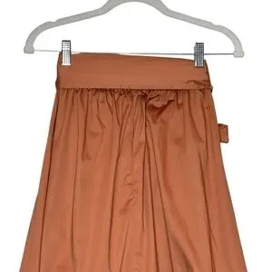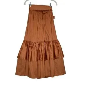 Brown/ rust cotton blend tiered wrap skirt. Side tie, side zipper, fully lined, pockets.