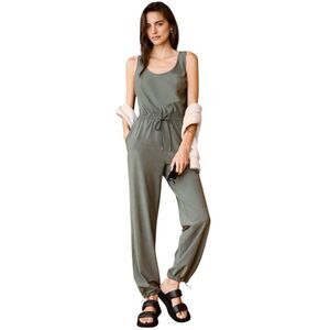 Stylish olive jumpsuit. Sleeveless design. Drawstring waist. Comfortable fit.