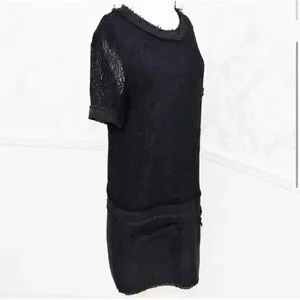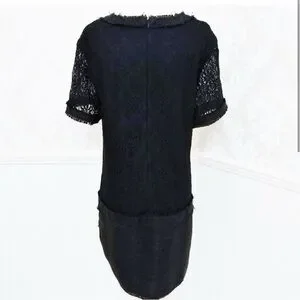 Sophisticated Rachel Zoe short sleeve shift dress in a rich navy blue, featuring a chic mix of geometric lace overlay and tweed-textured fabric. Finished with fringed neckline and sleeve hems, tweed-trimmed pockets, and a flattering shift silhouette. Fully lined with a back zipper. Perfect for cocktail parties, evening events, or polished office attire.
