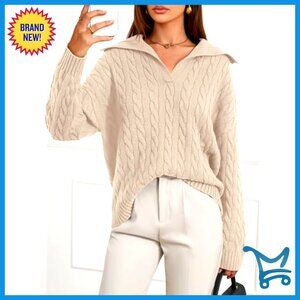 Oversized Cable Knit Sweater Polo V Neck Chunky Pullover Casual Chic