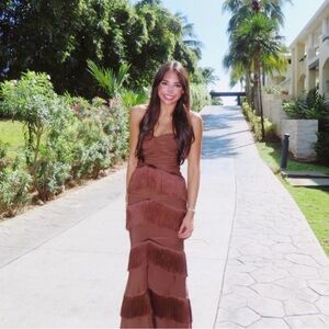Elegant strapless maxi dress. Features layered fringe design. Perfect for evening wear.