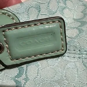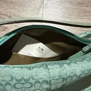 Stylish mint green shoulder bag by Coach. Features signature pattern and elegant design.