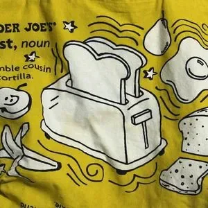 Details: Dual top shoulder straps, open top design, playful illustrated toast and waffle scenes with humorous dictionary-style definitions, small woven Trader Joe's logo tag at side