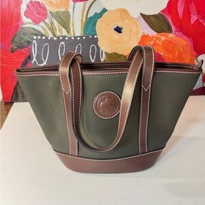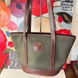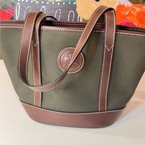 Stylish tote with olive canvas and chocolate leather trim. Perfect for everyday use. Timeless and chic.
