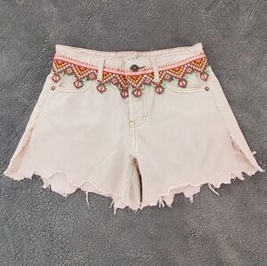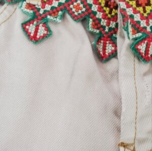 Trendy high-waisted cutoff shorts with colorful embroidered waist detail and raw hem. Eye-catching and unique look – perfect for summer festivals or casual wear.