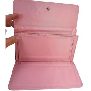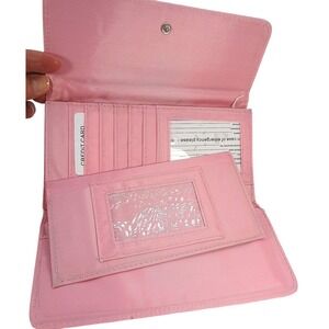NWT Modo Bella charming faux leather pink quilted long wallet featuring an all-over heart pattern. This clutch style wallet opens to reveal 6 card slots, two a clear ID slots, a removable checkbook cover, several bill compartments, a zippered compartment for coins or small essentials and a slip pocket on the back exterior. The interior is lined with a smooth satin-like fabric, and the exterior secures with a snap closure.
