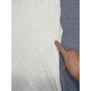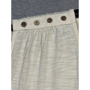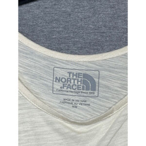 The North Face women's sleeveless shirt is a size M/M. It is made of a soft, lightweight fabric and features a round neckline, a relaxed fit, and a slightly longer length. The shirt has a subtle textured pattern and is a cream color. It has four brown buttons on each shoulder. The shirt is in pre-owned condition and has a small brown stain on the back. The shirt is otherwise in good condition with no other visible imperfections.
